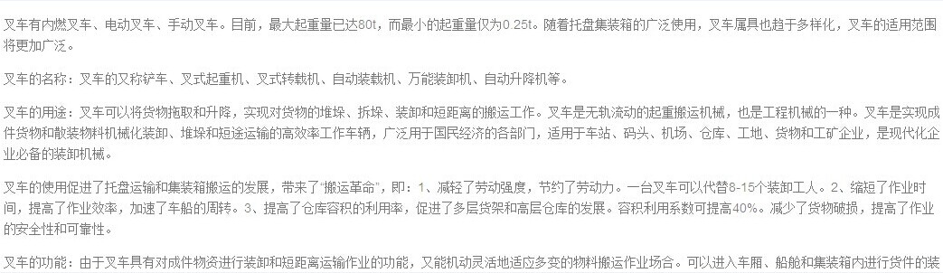 卸搬運(yùn)作業(yè),經(jīng)濟(jì)地滿足各種短途物料搬運(yùn)車作業(yè)的要求。叉車以內(nèi)燃機(jī)或蓄電池與電動機(jī)為動力,帶有貨叉承載裝置,具有自行能力,工作裝置可完成升降和前后傾、夾緊、推出等動作,能實(shí)現(xiàn)成件物資的裝卸、搬運(yùn)嗯哼拆碼垛作業(yè)。若配備其他屬具,還能用于取大件貨物散裝物資和非包裝物資的裝卸作業(yè)以及牽引和吊裝等工作。從而有效地減輕勞動強(qiáng)度,提高生產(chǎn)率,降低經(jīng)濟(jì)成本,增強(qiáng)作業(yè)性
